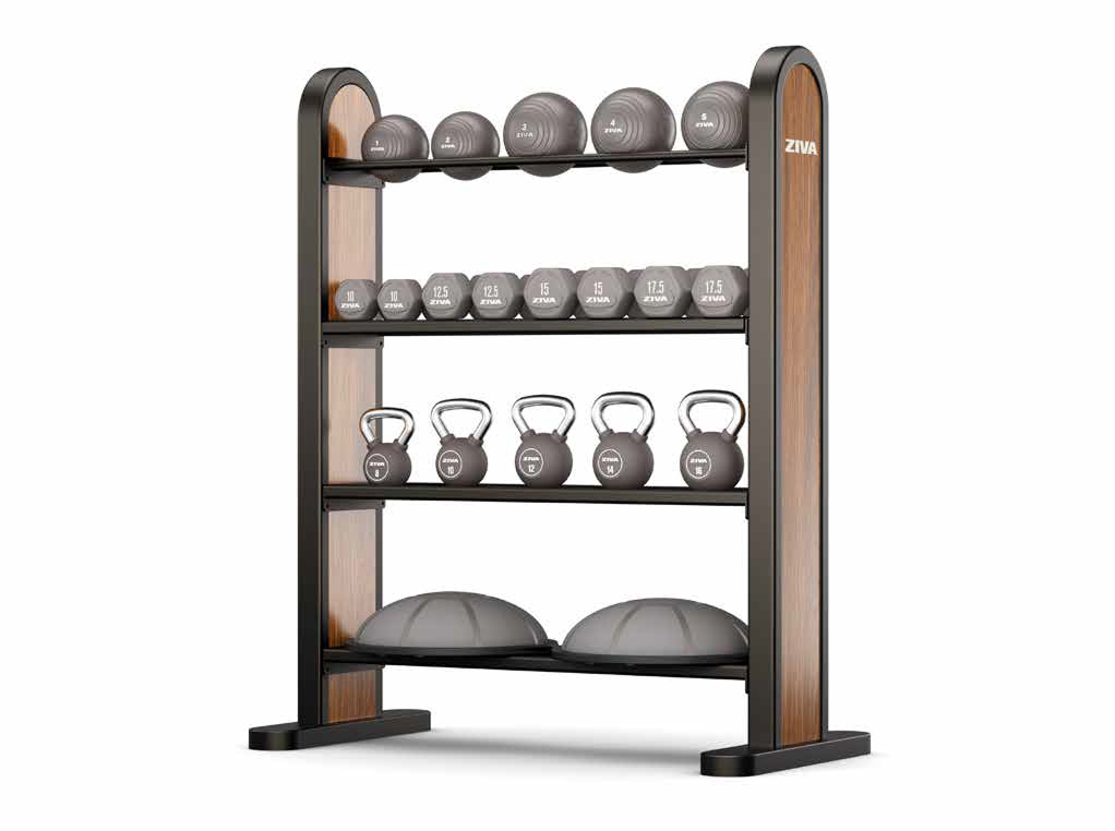 Uniwersalny stojak z 3 półkami PVC i szynami na piłki. Pomieści medicine balls, hantle, kettlebells, balance balls. Matowa stal + panele drewniane. Dostępny z kompletnym zestawem Lumina Toolkit lub osobno.